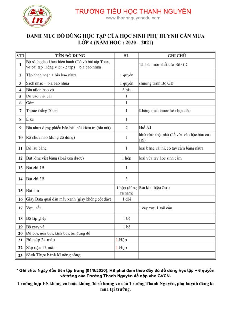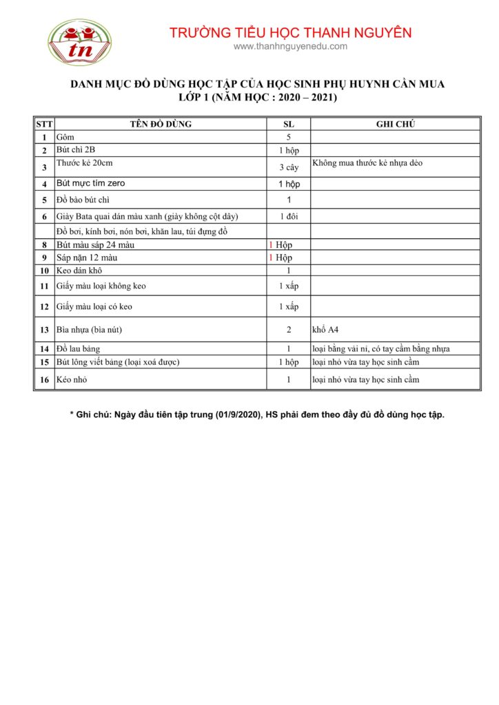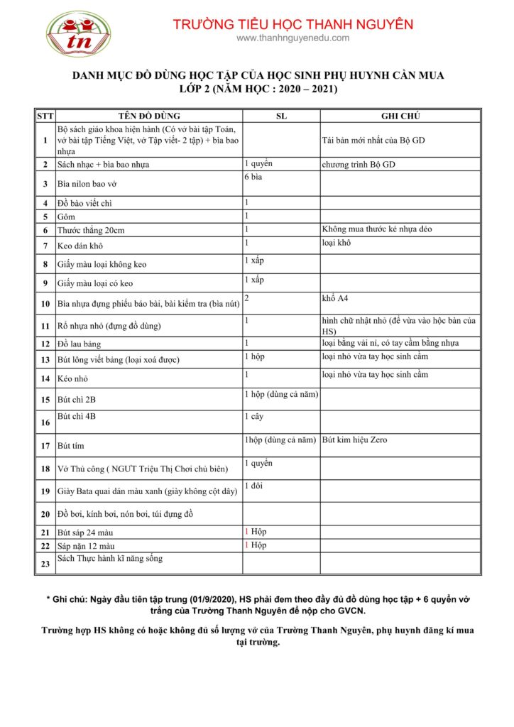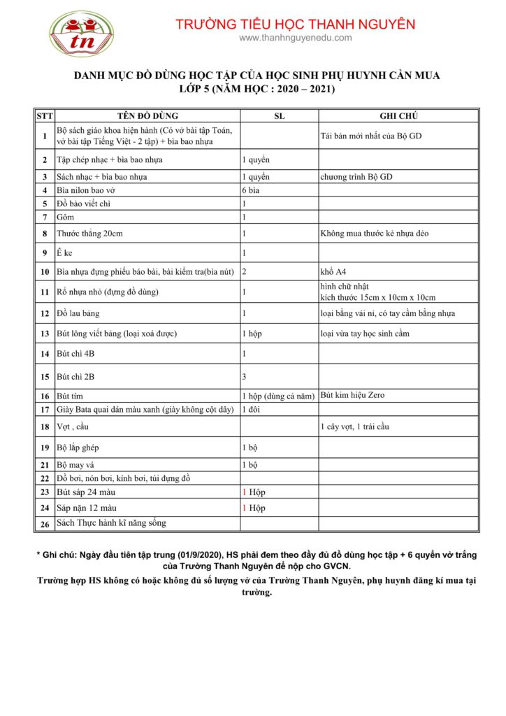 DANH MỤC ĐỒ DÙNG HỌC TẬP CỦA HỌC SINH TIỂU HỌC – NĂM HỌC 2020-2021