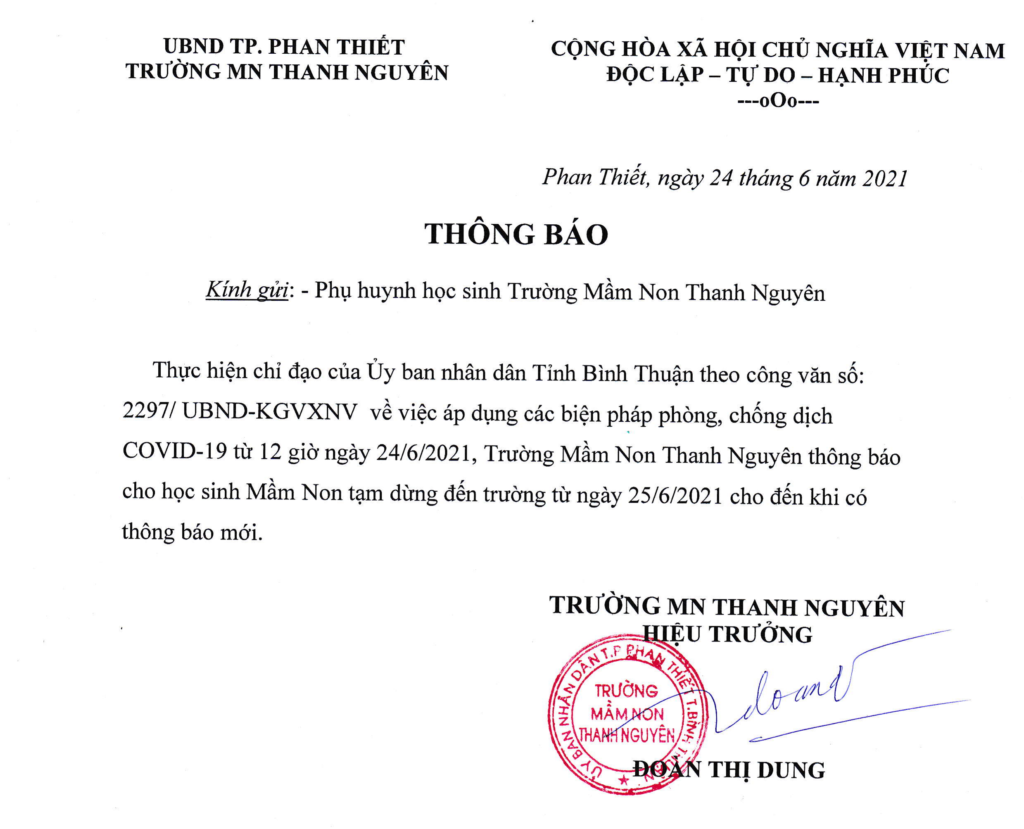 THÔNG BÁO ngày 24/06/2021 về việc cho học sinh mầm non tạm dừng đến trường để thực hiện phòng chống dịch Covid-19 24/06/2021 | Không có phản hồi