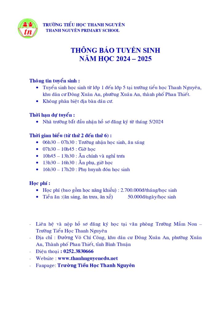 Trường Tiểu Học Thanh Nguyên thông báo Tuyển sinh 2024-2025 !